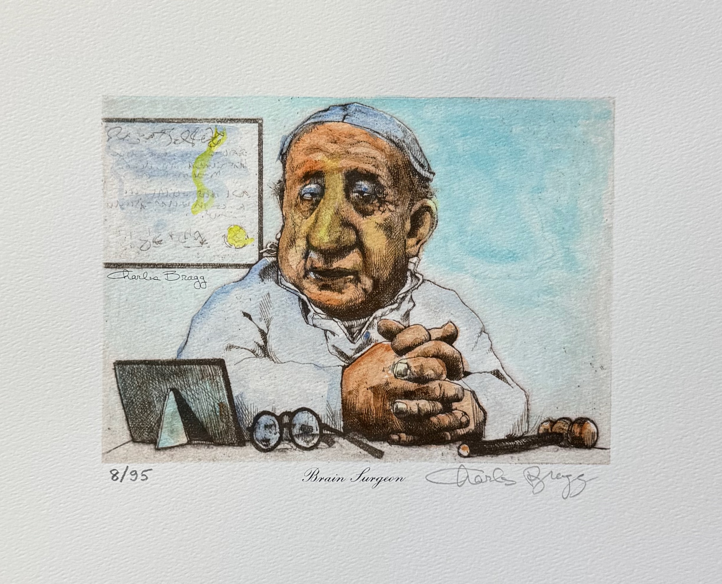 This is a Charles Bragg limited edition hand water colored lithograph titled “BRAIN SURGEON”.
