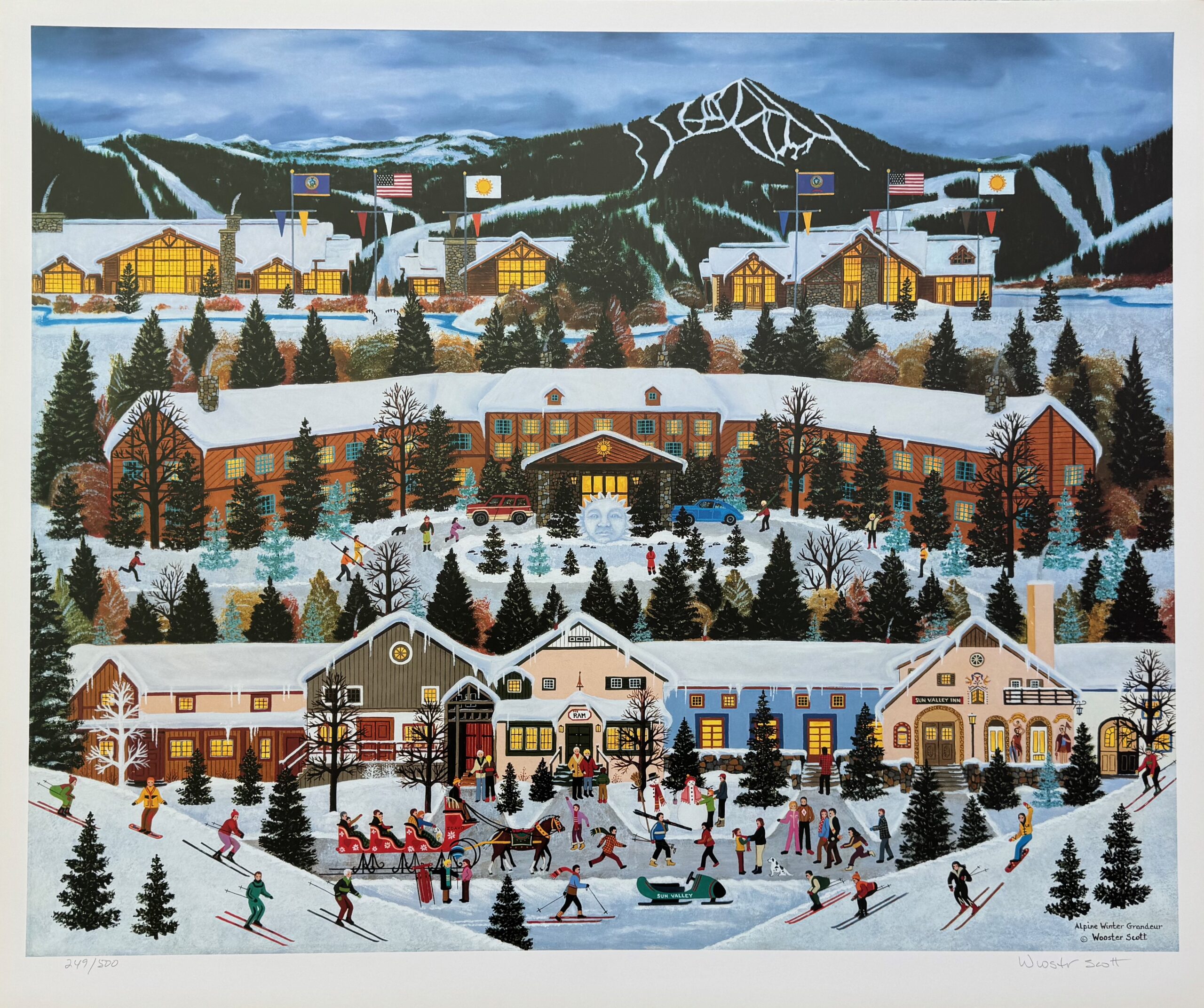 This is a Jane Wooster Scott limited edition hand signed lithograph titled “Alpine Winter Grandeur”.