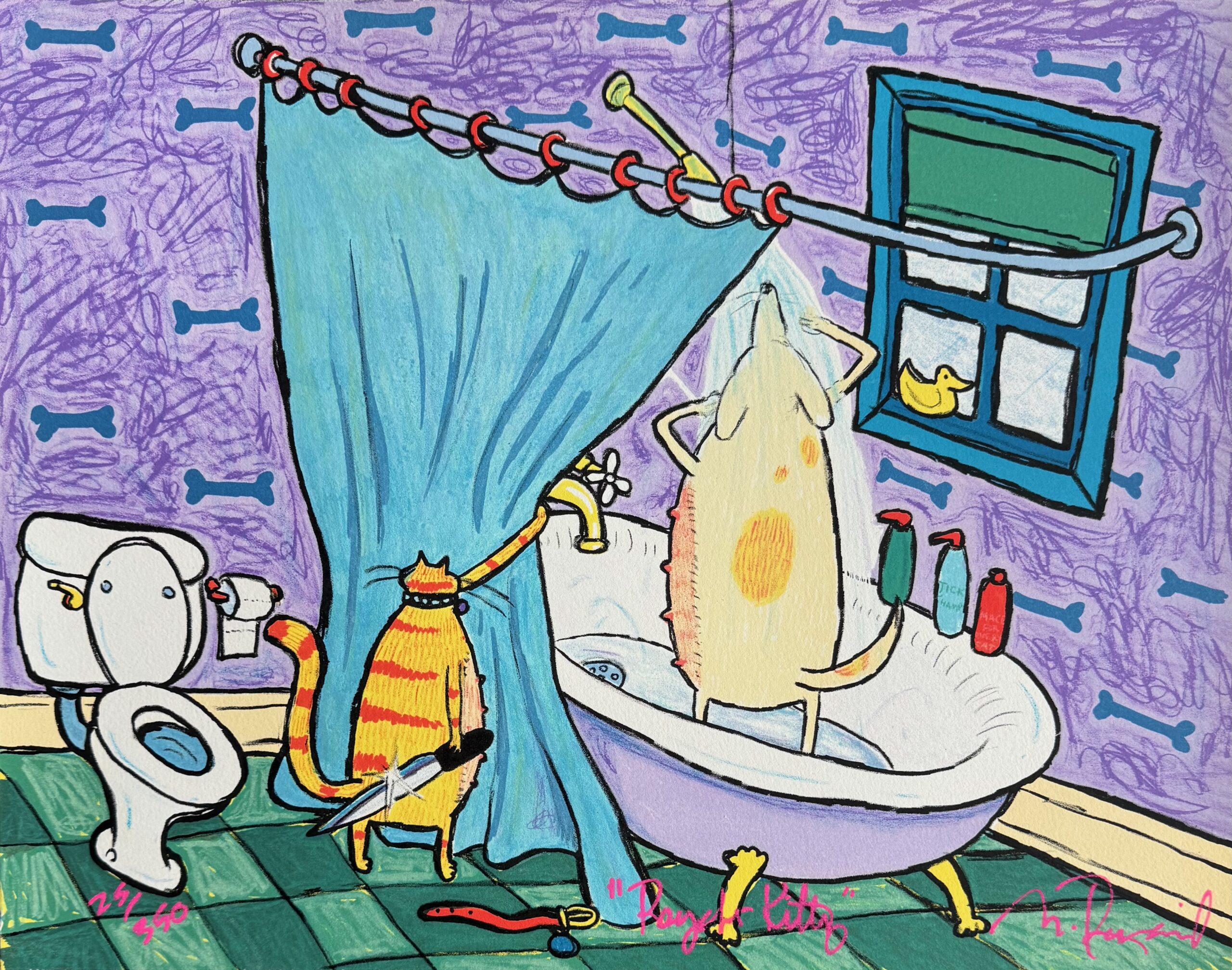 This is a hand signed original lithograph by Matt Rinard titled “Psycho Kitty”.