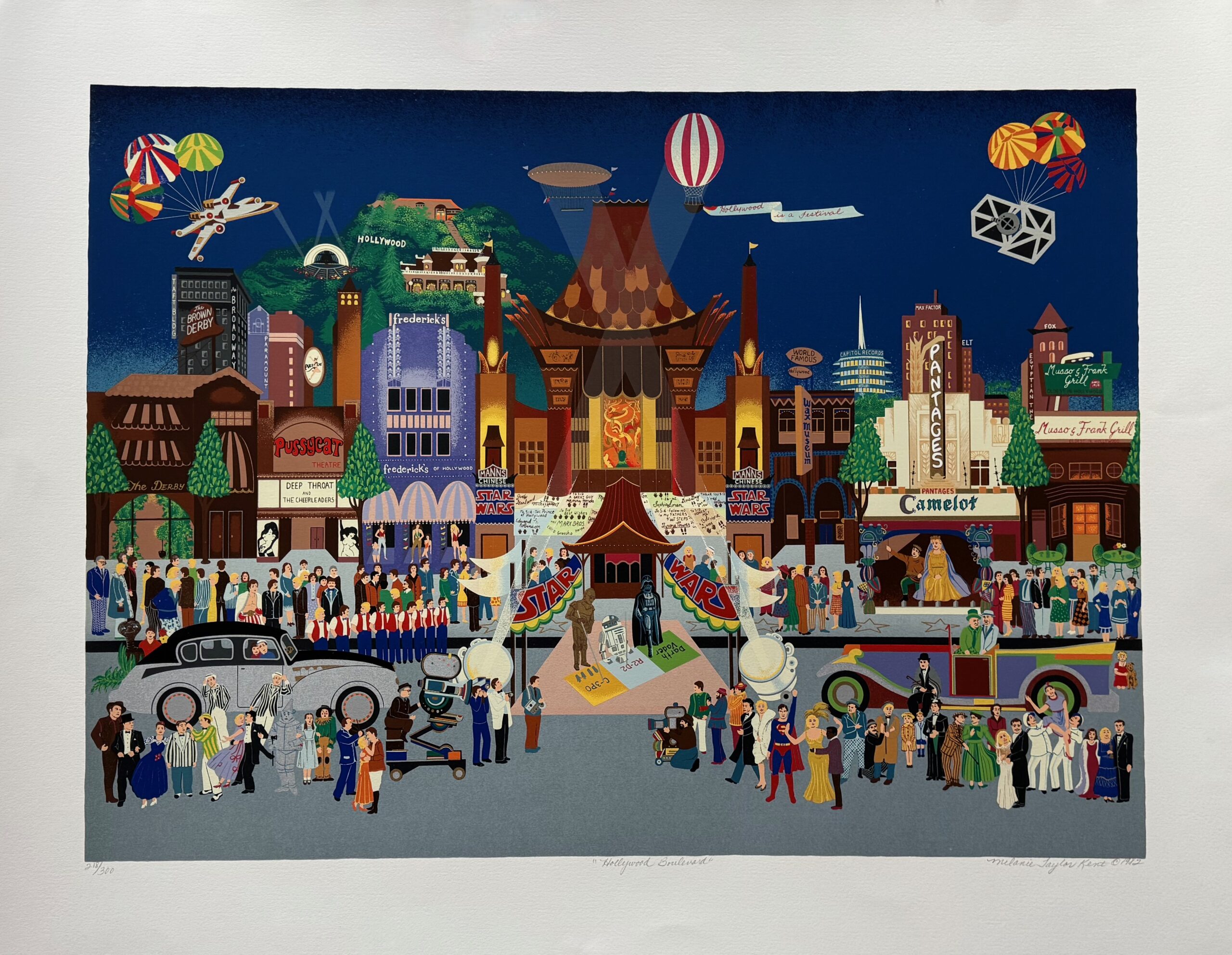 This is a 1982 limited edition original hand signed serigraph by Melanie Taylor Kent titled “Hollywood Boulevard”.